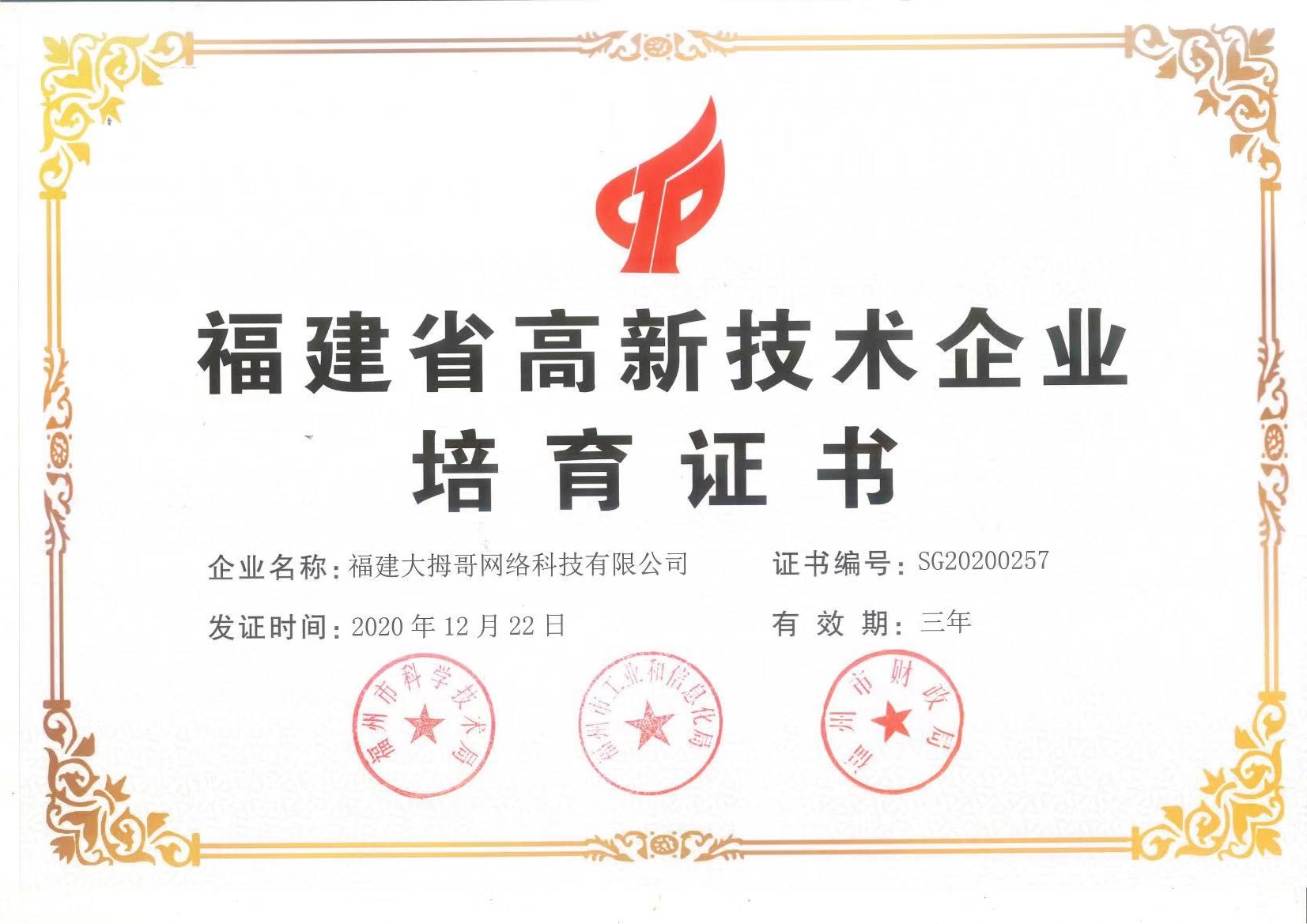 获得国家高新技术企业证书、福建省高新技术企业培育证书;